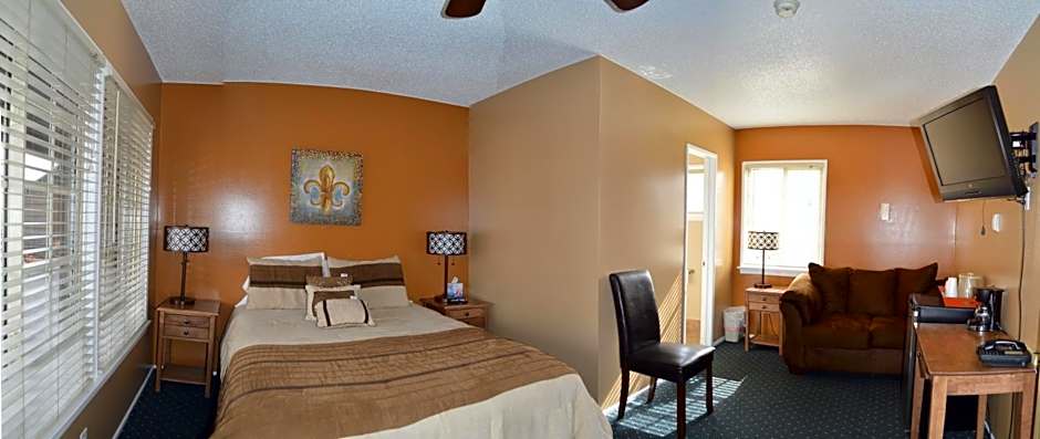 A kitchenette and a fireplace are featured in this room. The private bathroom also includes a spa bath and guests can enjoy a cable TV with a DVD player.